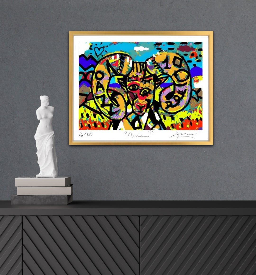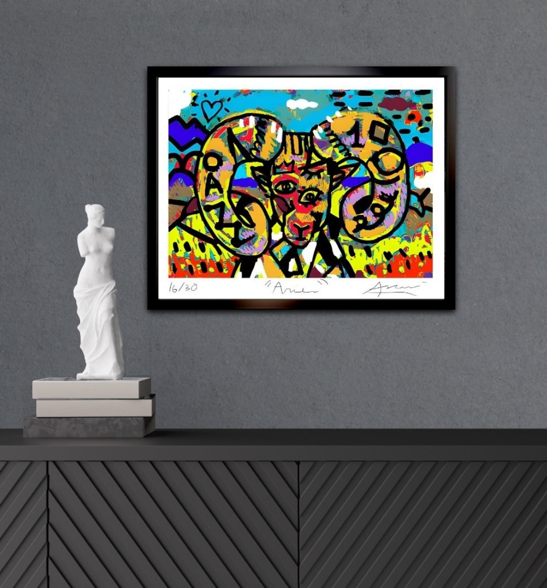 Esta obra representa la energía dinámica de Aries, signo cardinal de fuego. A través de una composición vibrante y contrastada, el artista fusiona símbolos astrológicos con un lenguaje visual expresionista. Los cuernos, convertidos en espirales de color, evocan el movimiento perpetuo de la creación. Enmarcada, la pieza refuerza su presencia escultórica y su carácter de obra única.