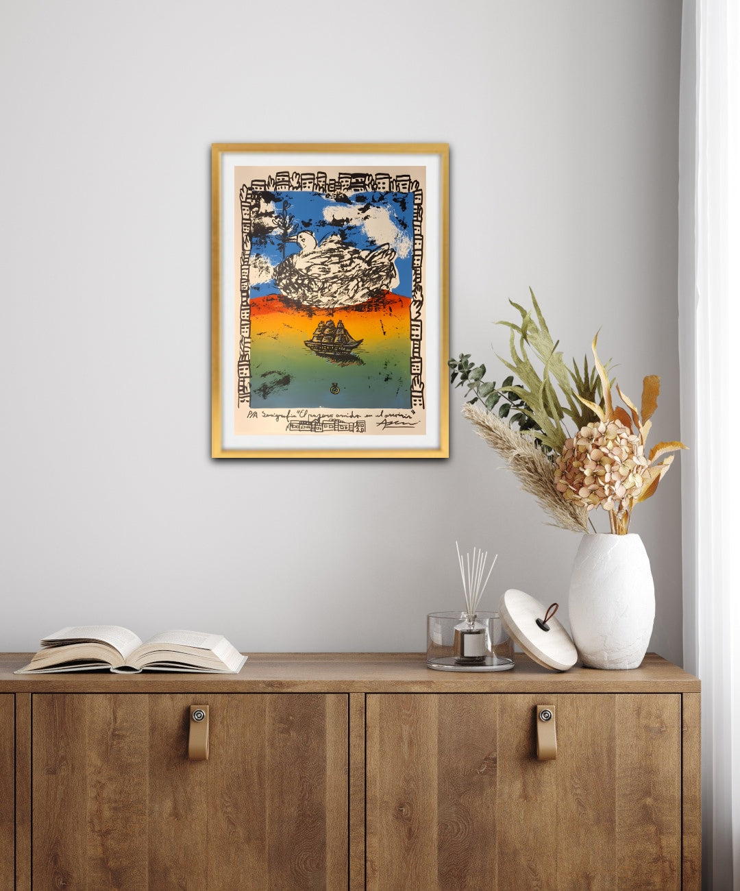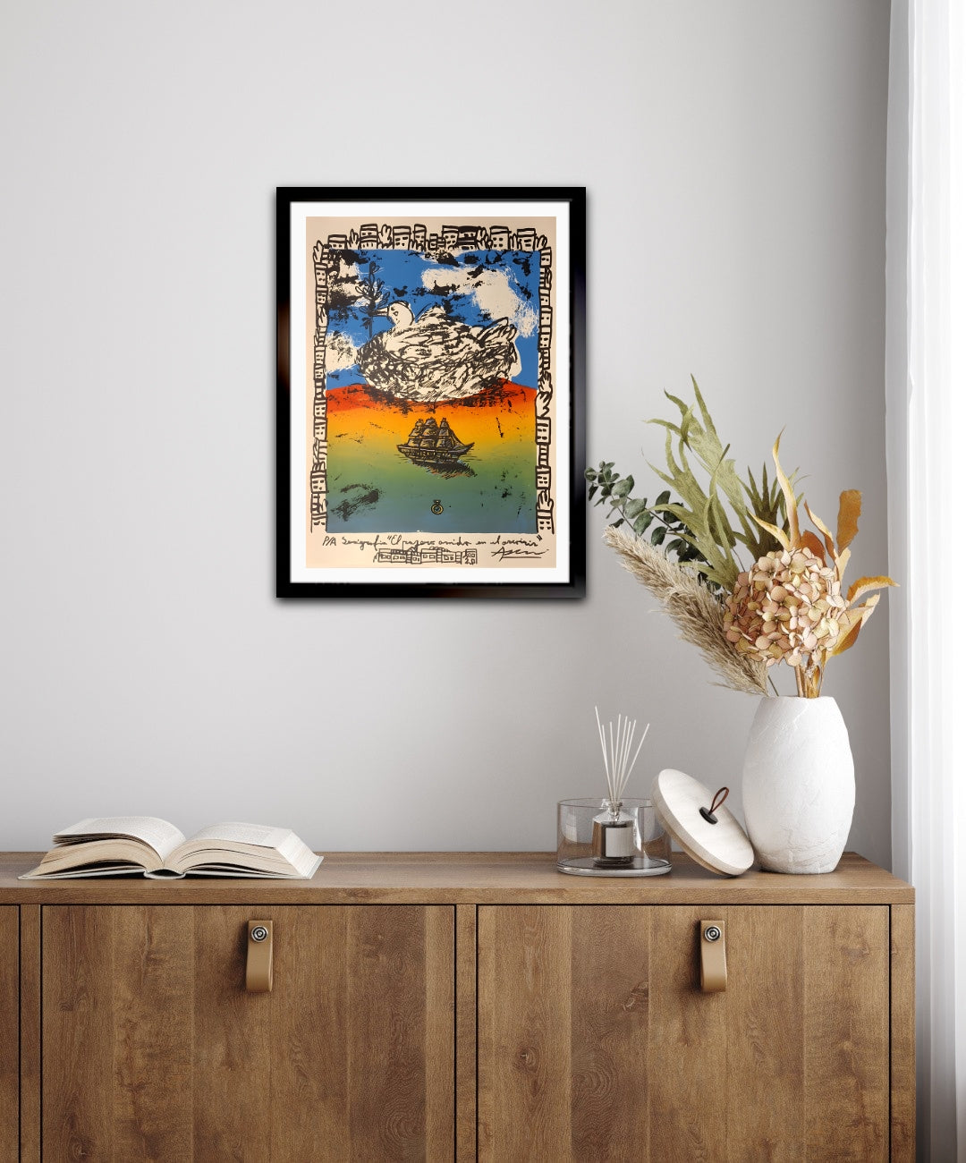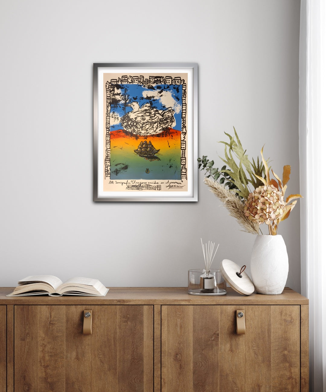 La serigrafía combina textura, gesto y narración visual para retratar un instante suspendido entre la calma y el movimiento. Un barco navega bajo el nido, recordando que todo viaje termina donde empieza el hogar.